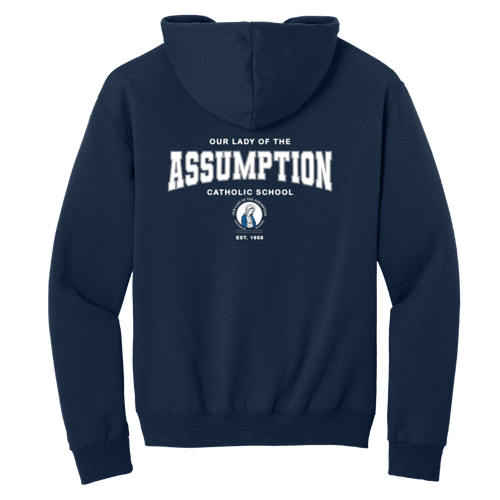 Navy hooded sweatshirt with zipper. 8-ounce, 50/50 cotton/poly NuBlend® pill-resistant fleece.